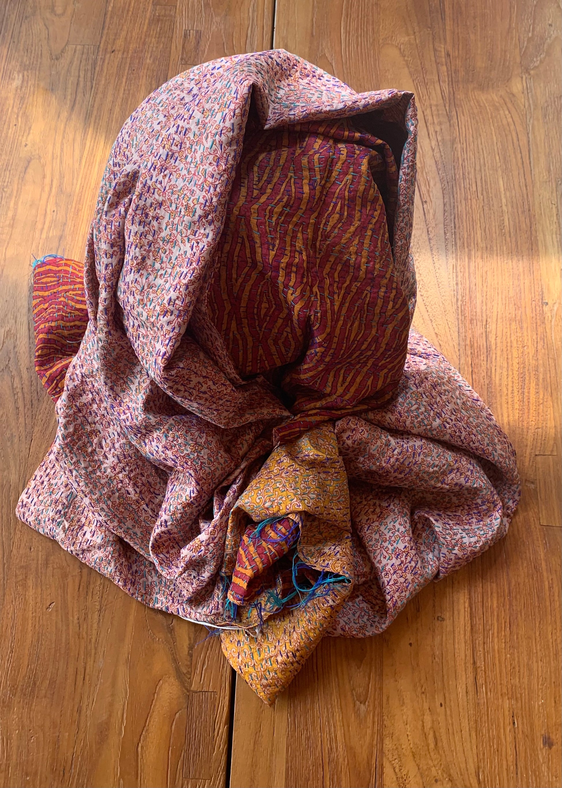 Les Étoles Kantha sont l'alliance parfaite de l'élégance et du raffinement. Fabriquées à partir de saris anciens en soie, leur motif unique et réversible apporte une touche de sophistication à toutes vos tenues. Portez-la en écharpe, en paréo ou même en décoration pour une touche artistique.
