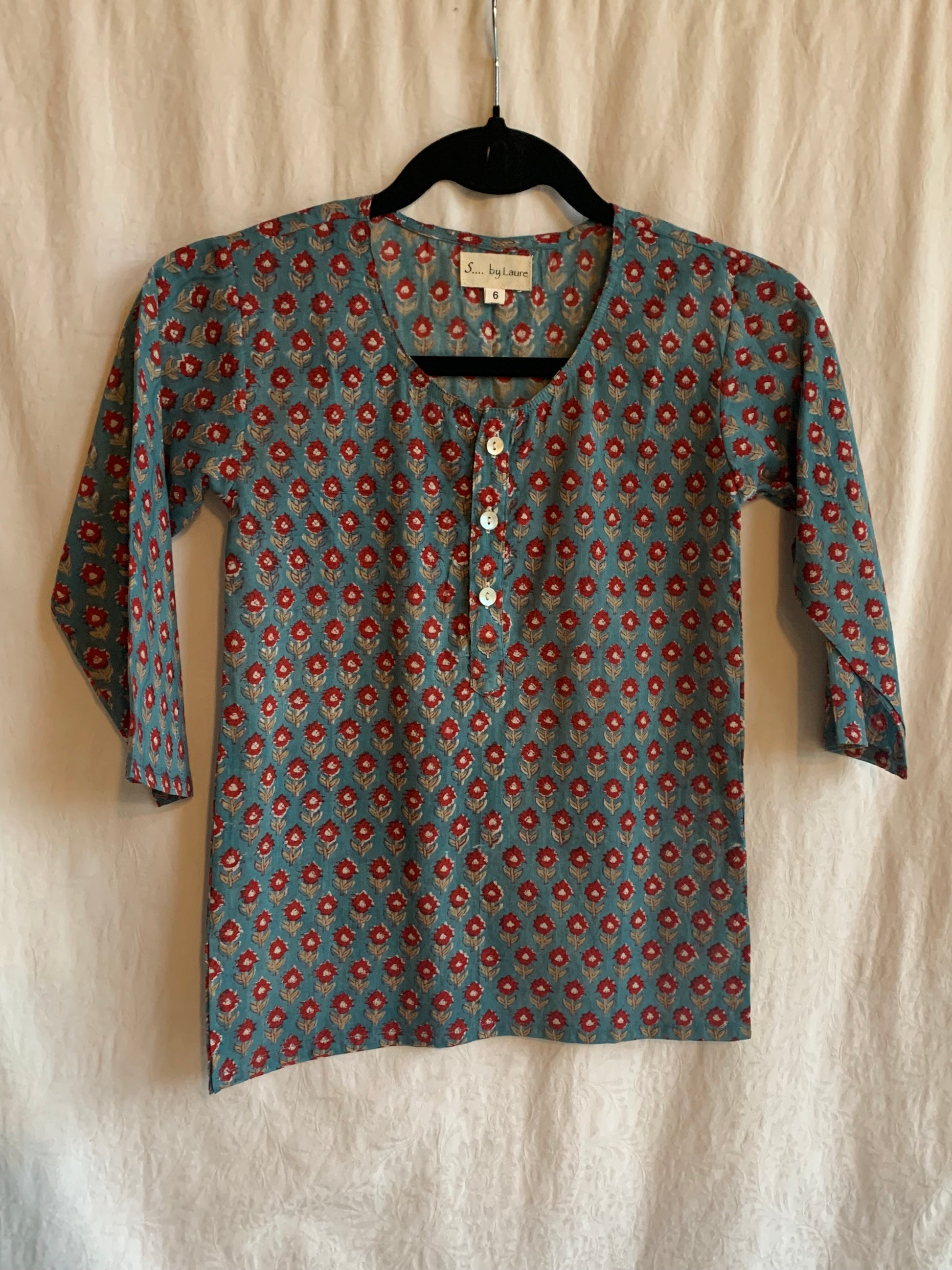Tunique enfant en coton indien avec motifs block print, parfaite pour un look décontracté et tendance. S'enfile facilement sur un short ou un jean pour un style instantané que les enfants adorent.